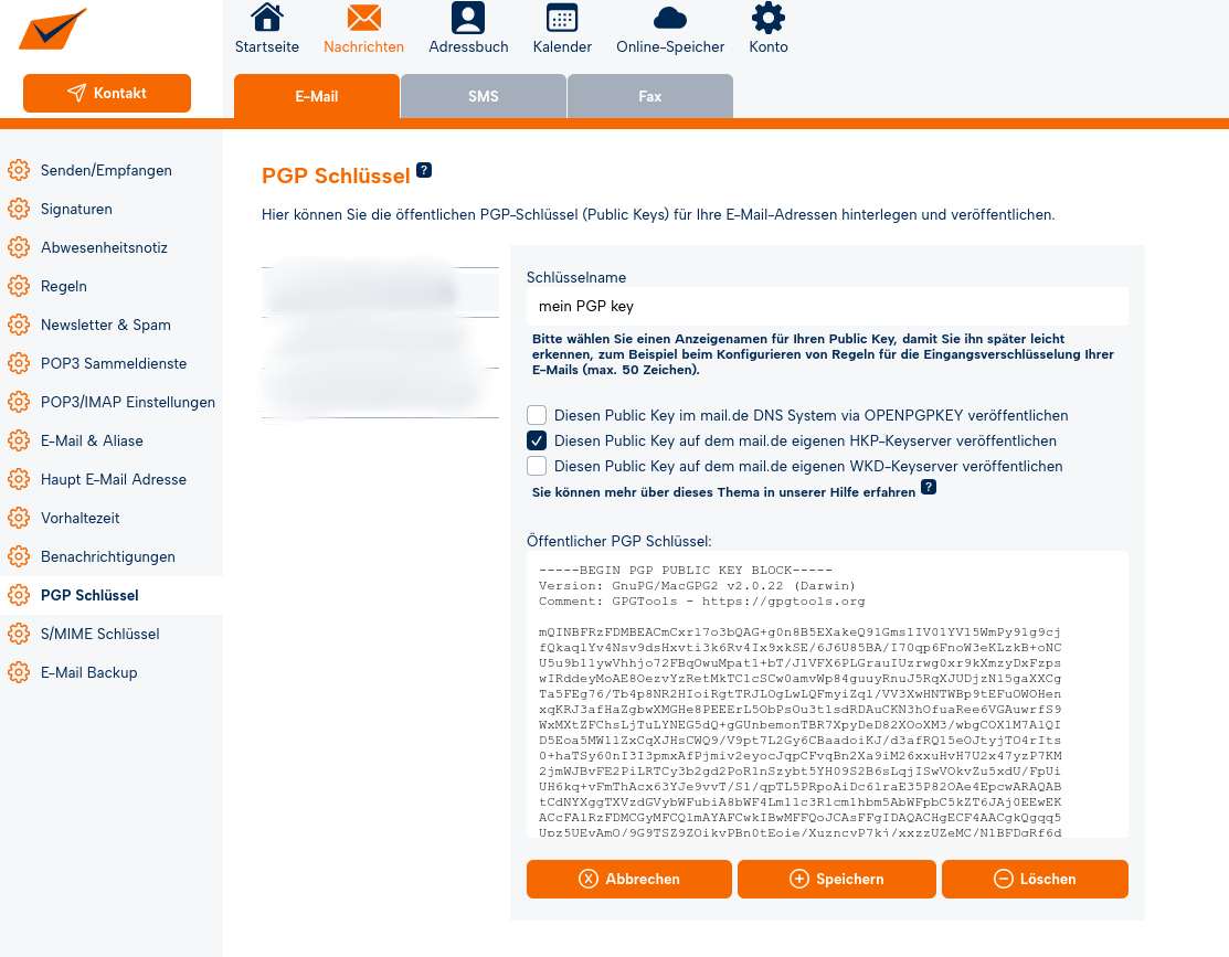 Über eine HKP-Anfrage direkt an den mail.ch HKP-Server (hkps://hkp.mail.de) kann weltweit jeder Ihren Public Key ermitteln. Dieses Protokoll ist verschlüsselt (HTTPS), sodass niemand mitlauschen oder den Schlüssel bei der Übertragung verändern kann.