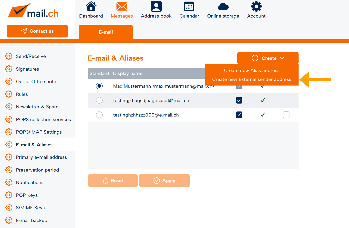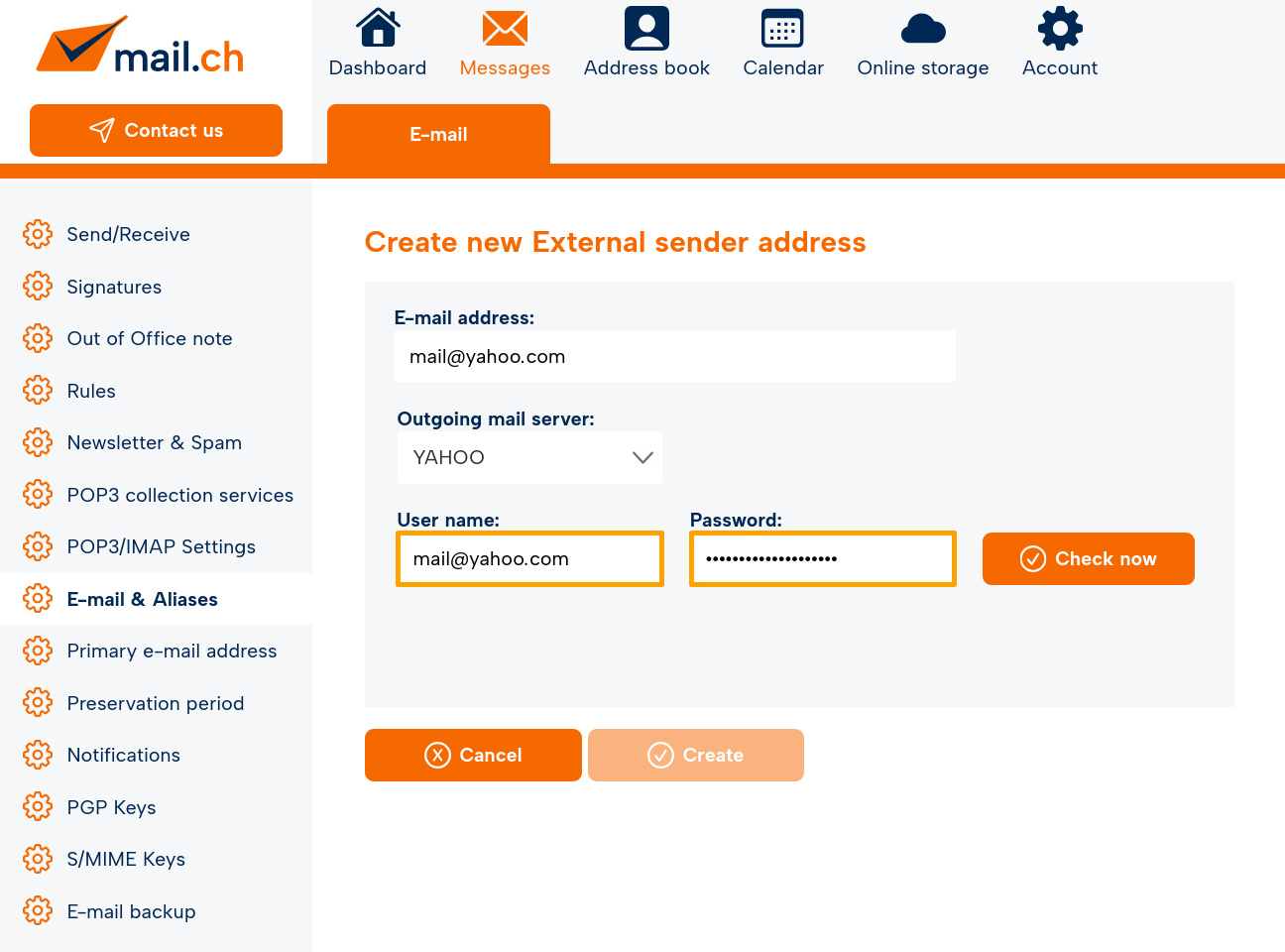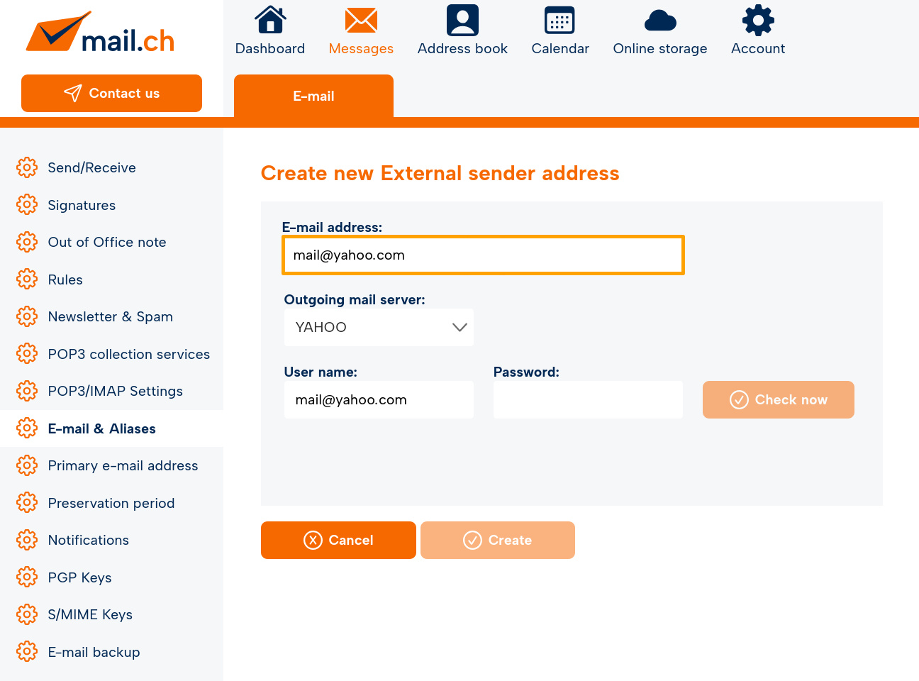 You have the option of sending e-mails from mail.chWebmailer using your e-mail addresses from other providers.