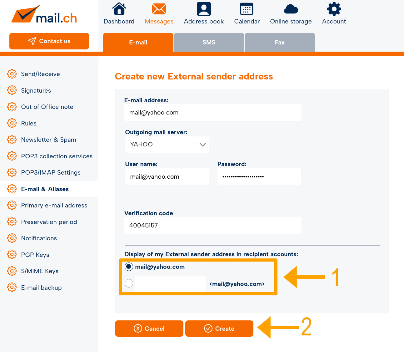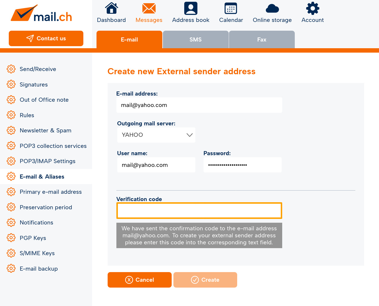 Click on "Create" to check the confirmation code and set up the external sender address.